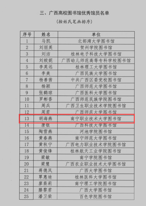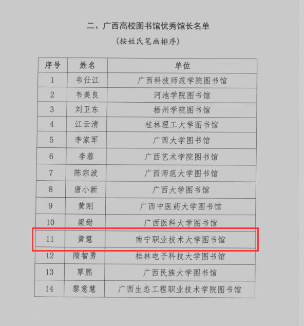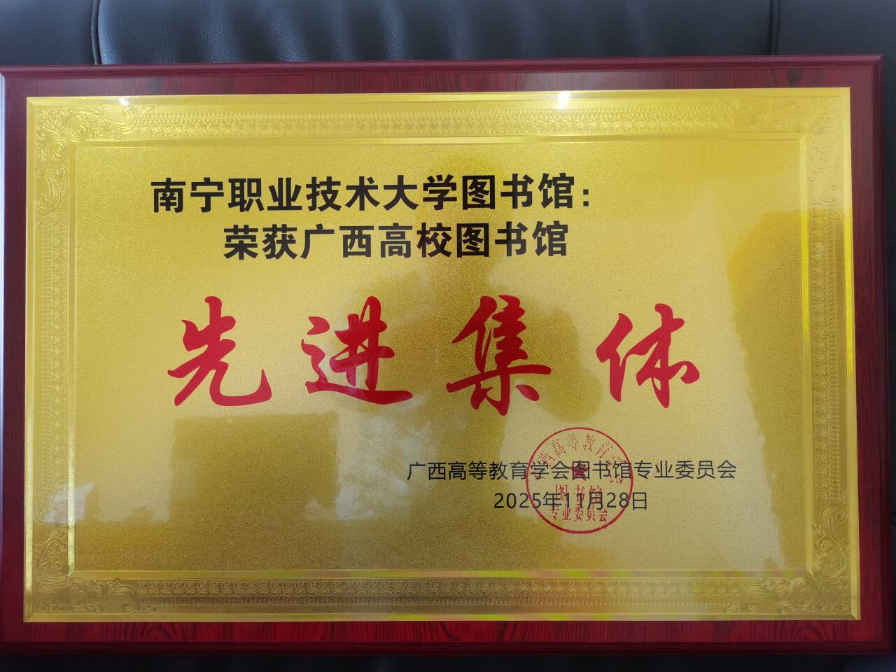 2025年11月28日,广西高校图书馆工作与学术年会在广西大学盛大召开,我校图书馆荣膺广西高校图书馆“先进集体”称号,图书馆(档案馆)副馆长黄慧摘得“优秀馆长”殊荣,馆员胡海燕荣获“优秀馆员”荣誉。值得一提的是,此次表彰活动首次设立“先进集体”奖项,我校图书馆在本次评选中脱颖而出,成为唯一获得“先进集体”称号的职业院校图书馆,并且是唯一一所囊括三项荣誉的职业院校图书馆。