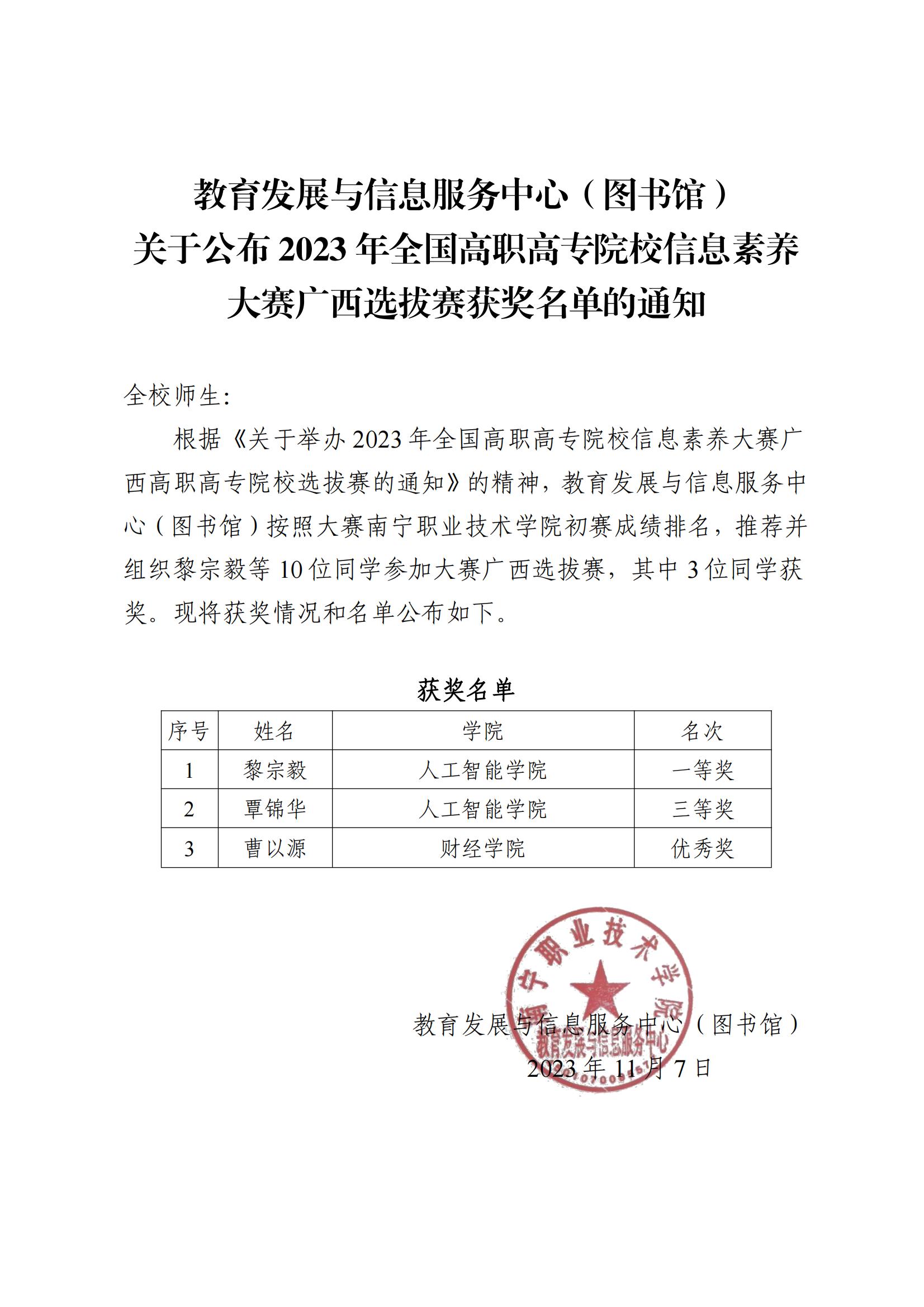 上一条:教育发展与信息服务中心(图书馆)2023年11月勤工助学岗位招聘通知 下一条:教育发展与信息服务中心(图书馆)关于公布2023年全国高职高专院校信息素养大赛广西选拔赛南宁职业技术学院初赛获奖名单的通知