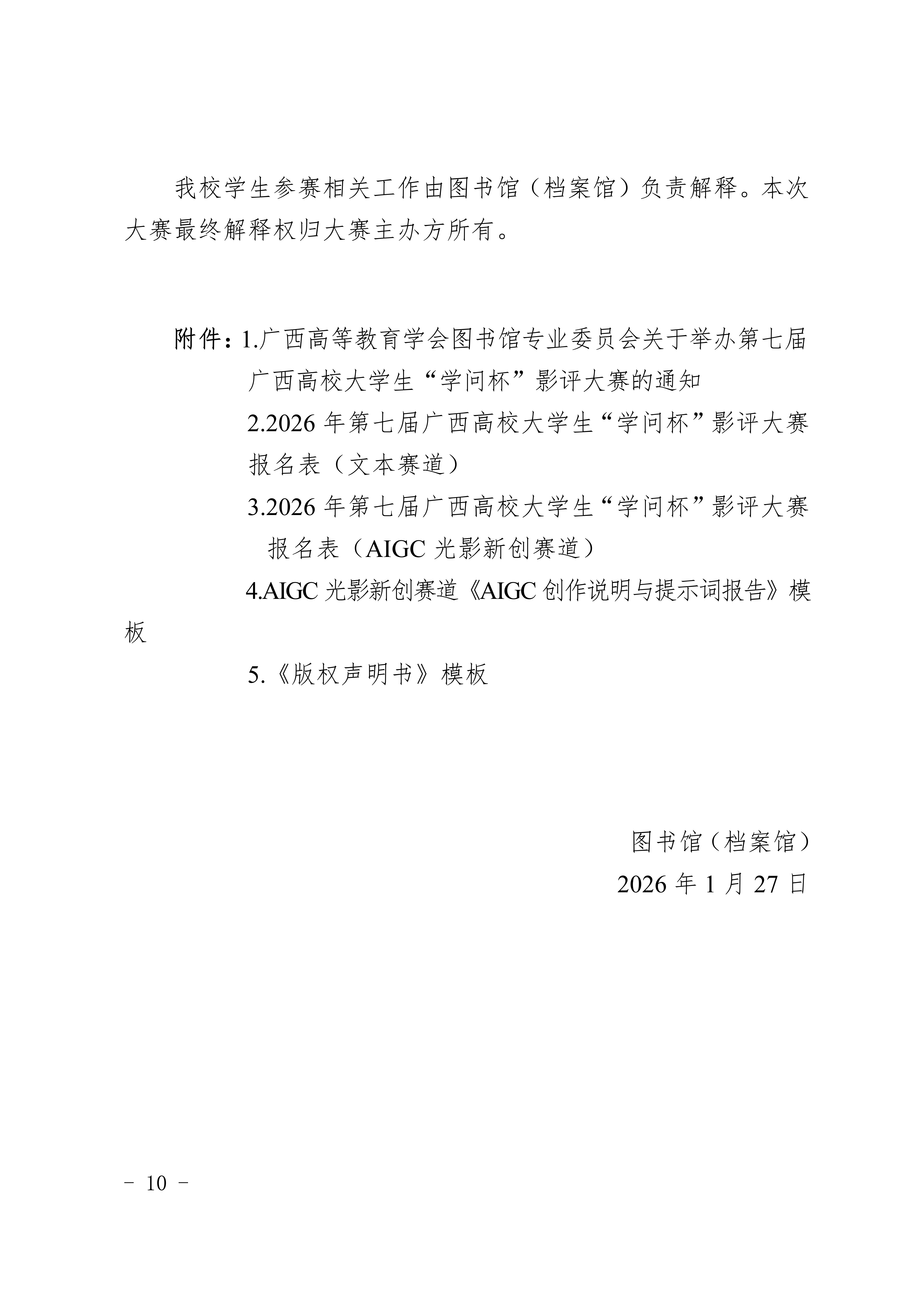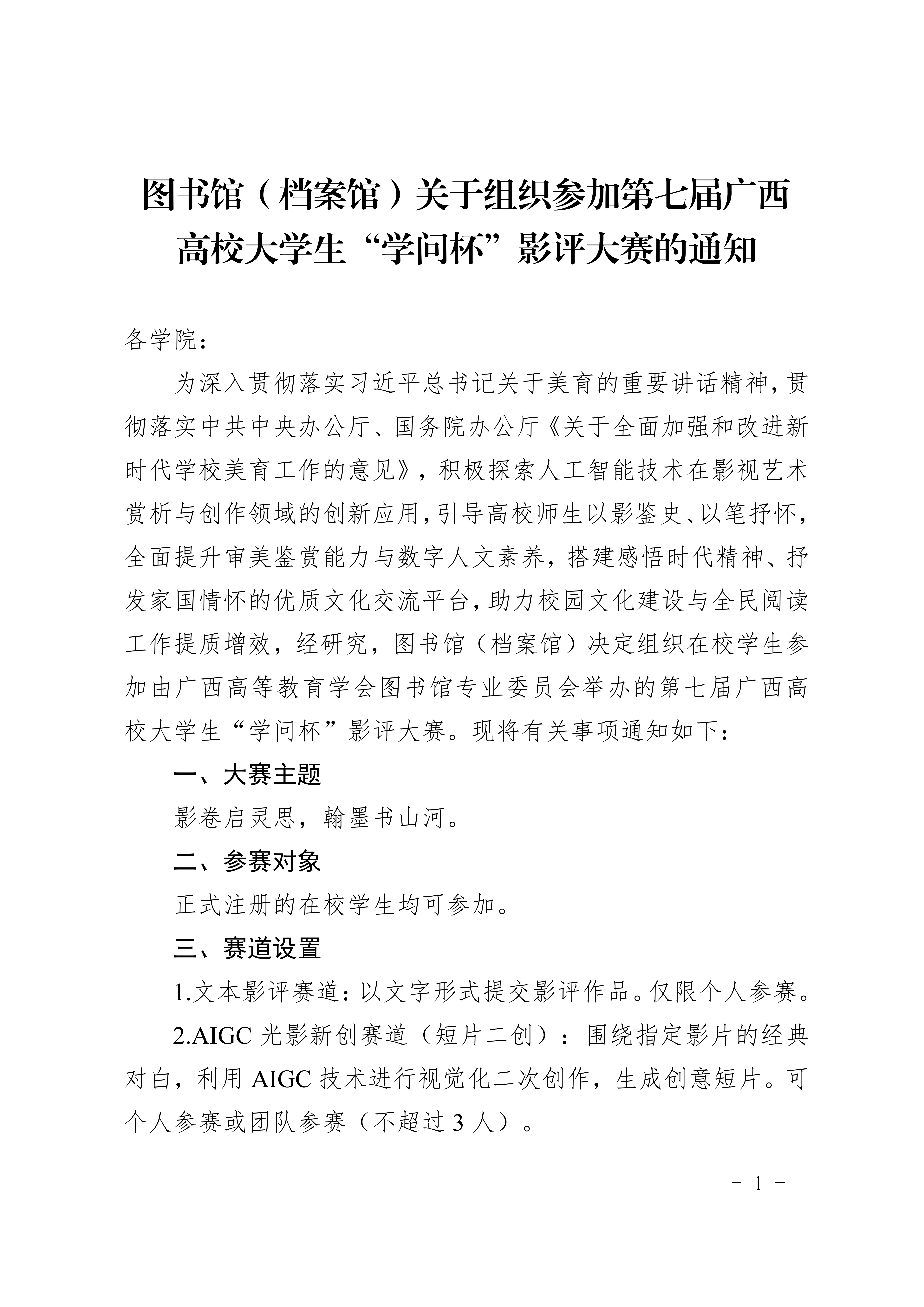 图书馆(档案馆)关于组织参加第七届广西 高校大学生“学问杯”影评大赛的通知